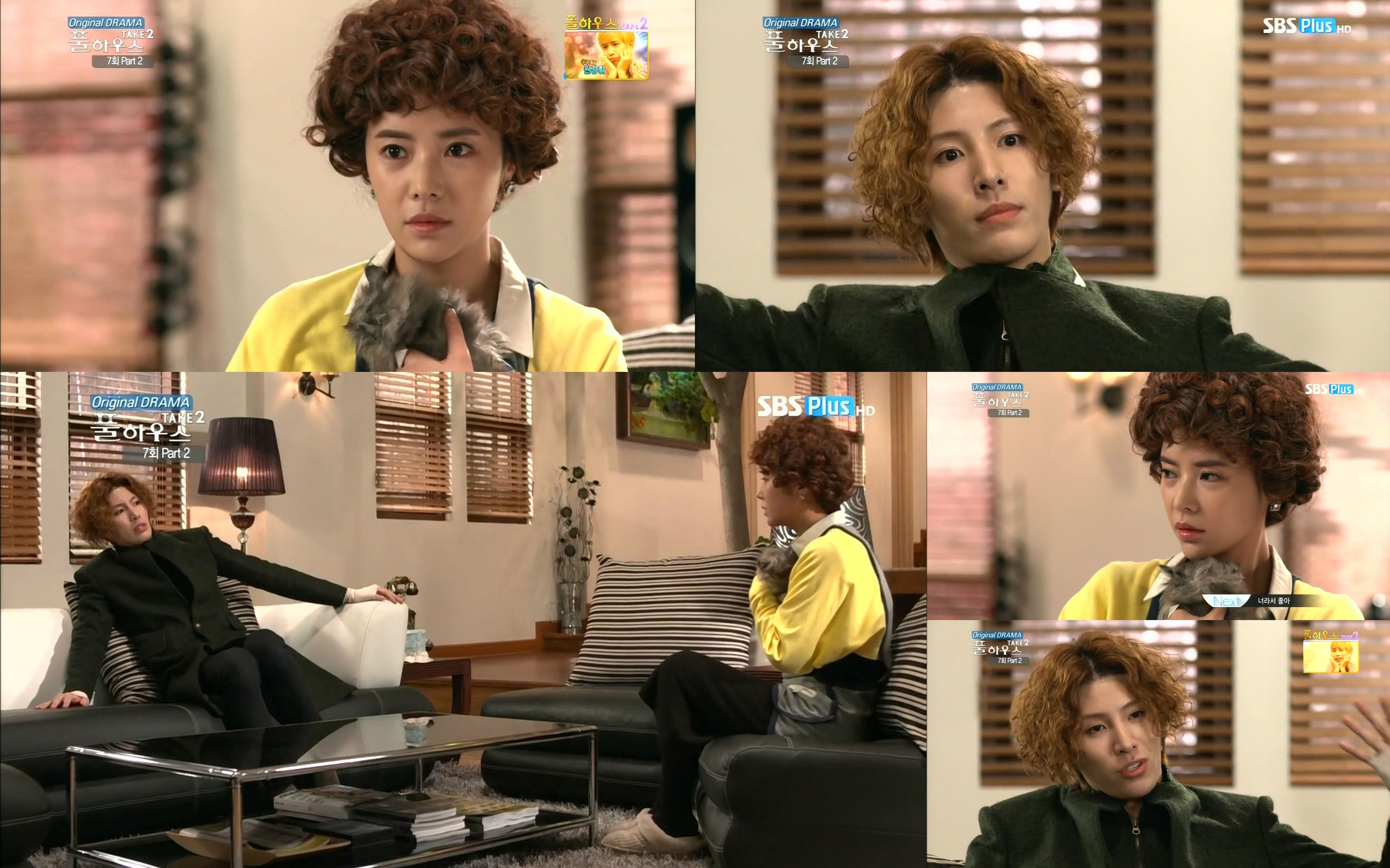 Tae Ik sits gingerly on the couch and scolds Man Ok for bringing in a kitten. Man Ok says she bought it because she she was lonely after moving into his house. Doesn’t she know he’s allergic to all fur? Yes, she knows. This stuns Tae Ik. She knows and still did this? Man Ok then says she has a right to have a kitten in his house, doesn’t she? She’ll take care to ensure that he doesn’t know its there. Right? Right? Can she really say that while looking at him right now? There is no way that she can raise the kitten without him noticing. Man Ok says she’ll raise it in the basement. The basement? Man Ok says that if he insists on kicking the cat out, he’ll have to kick her out, too. They get into a staring contest until Tae Ik’s allergies flare up even worse. He backs off and tells her that the cat must stay in the basement or else it’s out. LMAO. He always gives in to her in the end.No Min Woo, Hwang Jung Eum