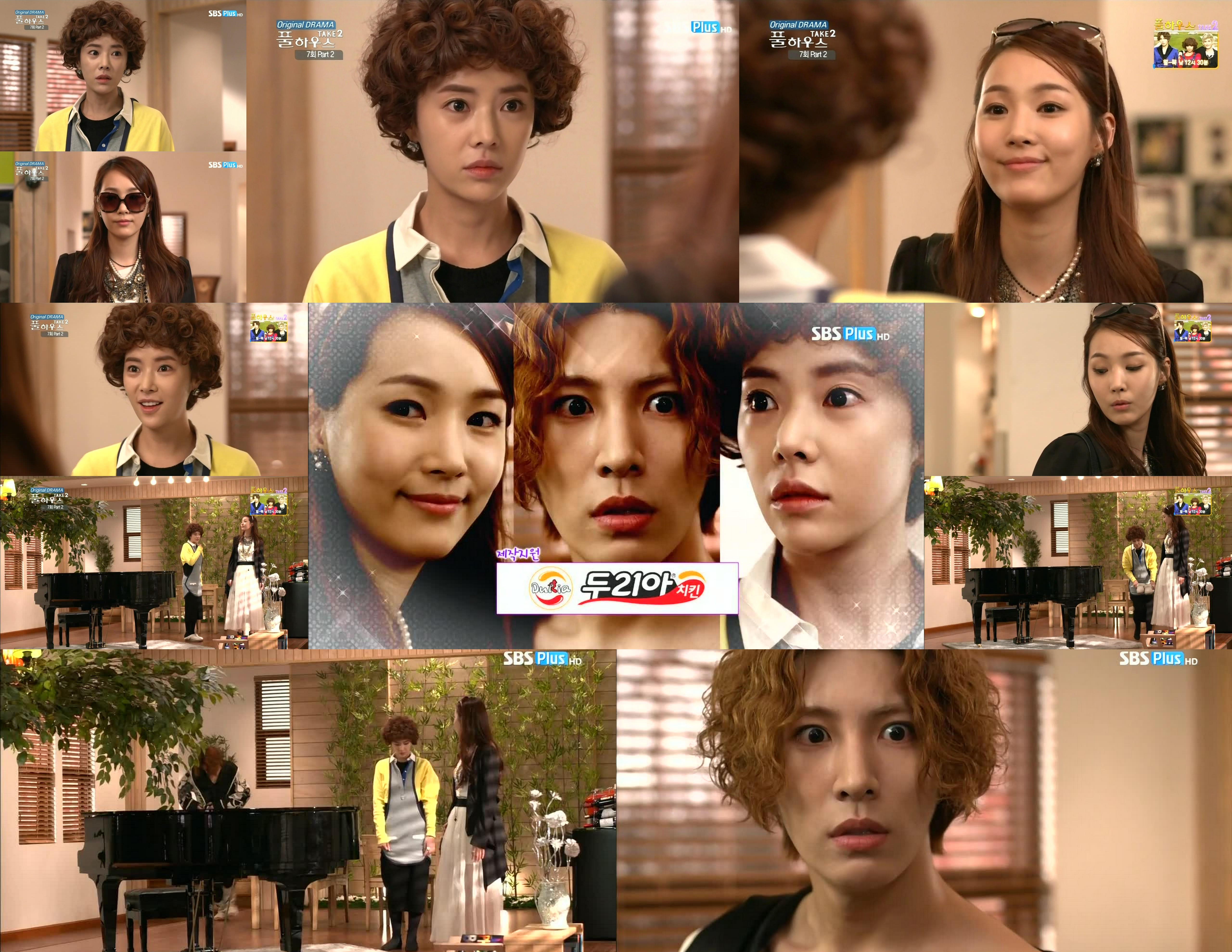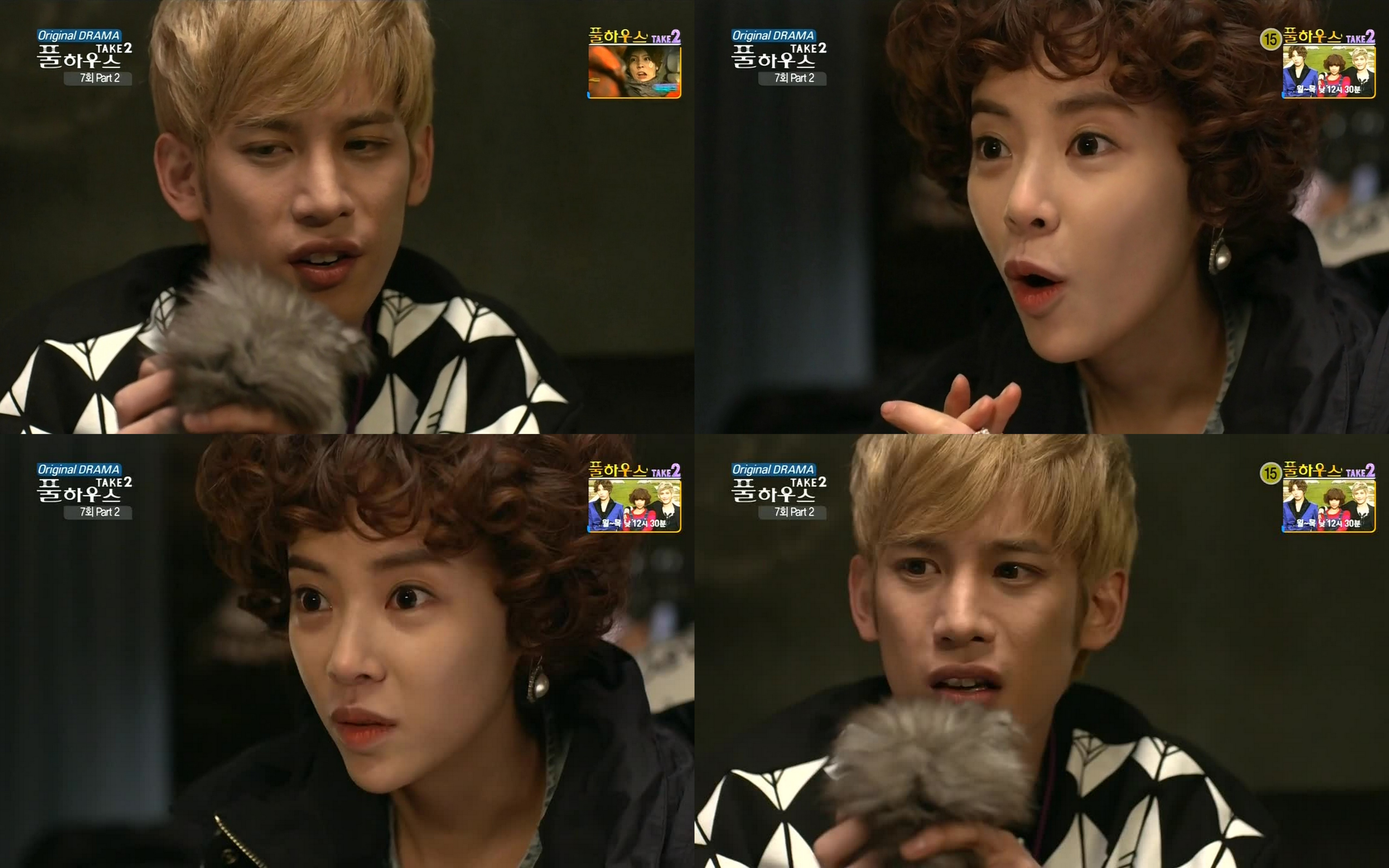 Meanwhile, Man Ok is in the basement sniffing Chaton who reeks. Just what did Kang Hwi feed him? Kang Hwi responds his left over sandwich was on the floor and he thinks the kitten at the rest of it including the onion. Man Ok scolds the kitty and sniffs again. They need to wash the cat. Kang Hwi wonders if they should do it at night. Man Ok looks at her watch and says they can do it now since Tae Ik has gone to practice. They feed the kitten milk and Man Ok leaves to get the bath water. Kang Hwi sits down and pets his new friend. He then sees someone coming and grabs the kitten and milk and hides under the counter again. It’s Tae Ik still trying to sing his new song. He goes to the fridge for water and drops the cap. Before he can bend to pick it up, Kang Hwi releases Chaton. Tae Ik freaks when he sees the cat. Enter Man Ok. He and Man Ok stare at each other and screaming ensues.No Min Woo, Park Ki Woong, Hwang Jung Eum