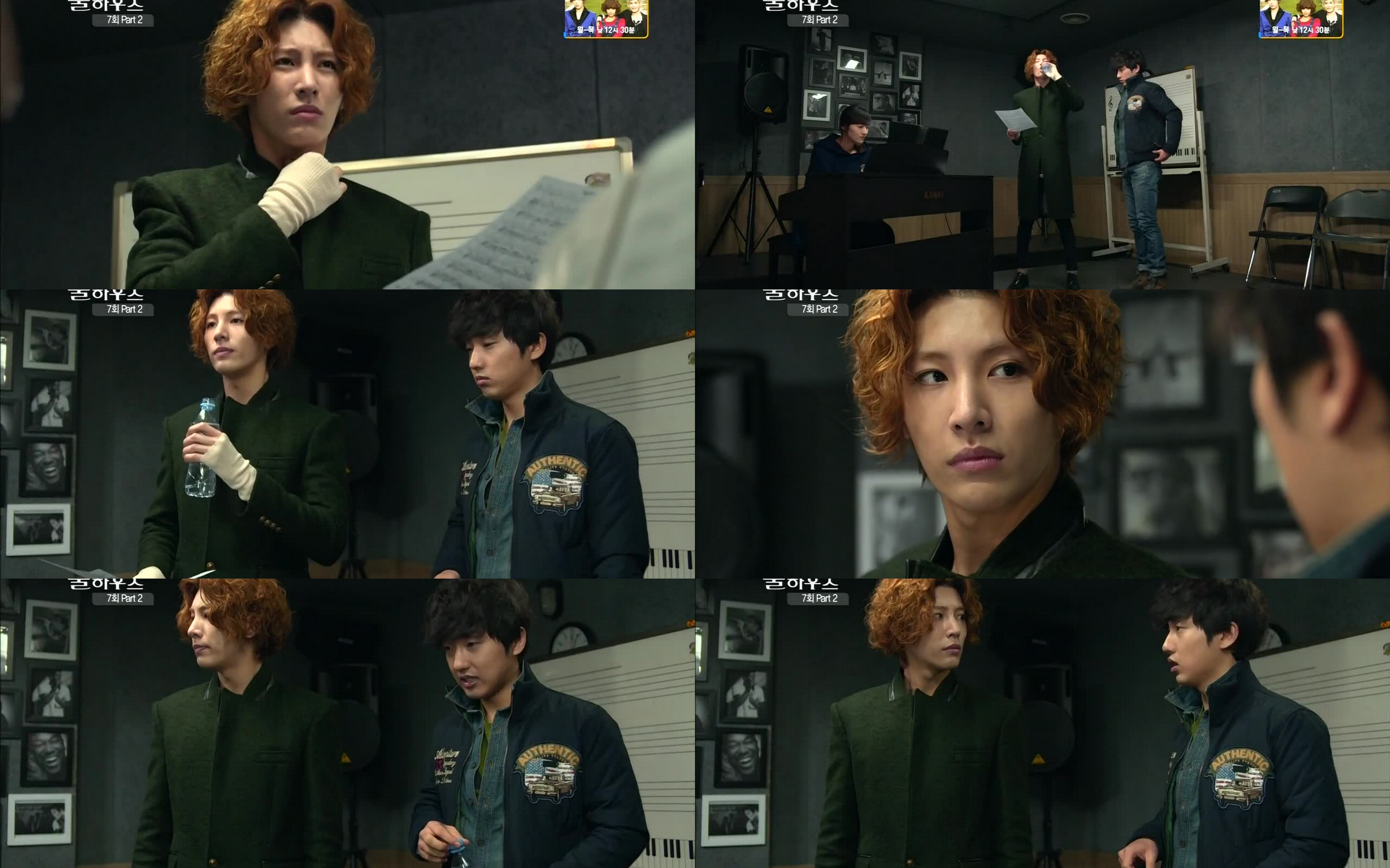 Tae Ik is practicing his new song. It’s kind of horribly off key and he can’t even hit the high notes. He stops and Go Dong gives him water. Tae Ik says his condition isn’t good and Go Dong replies he’s done better than usual. Glare. LOL. Tae Ik then calls a halt to practice even though he hasn’t been doing it long. Go Dong is worried. Is Tae Ik’s condition really not that good right now? Another glare.No Min Woo