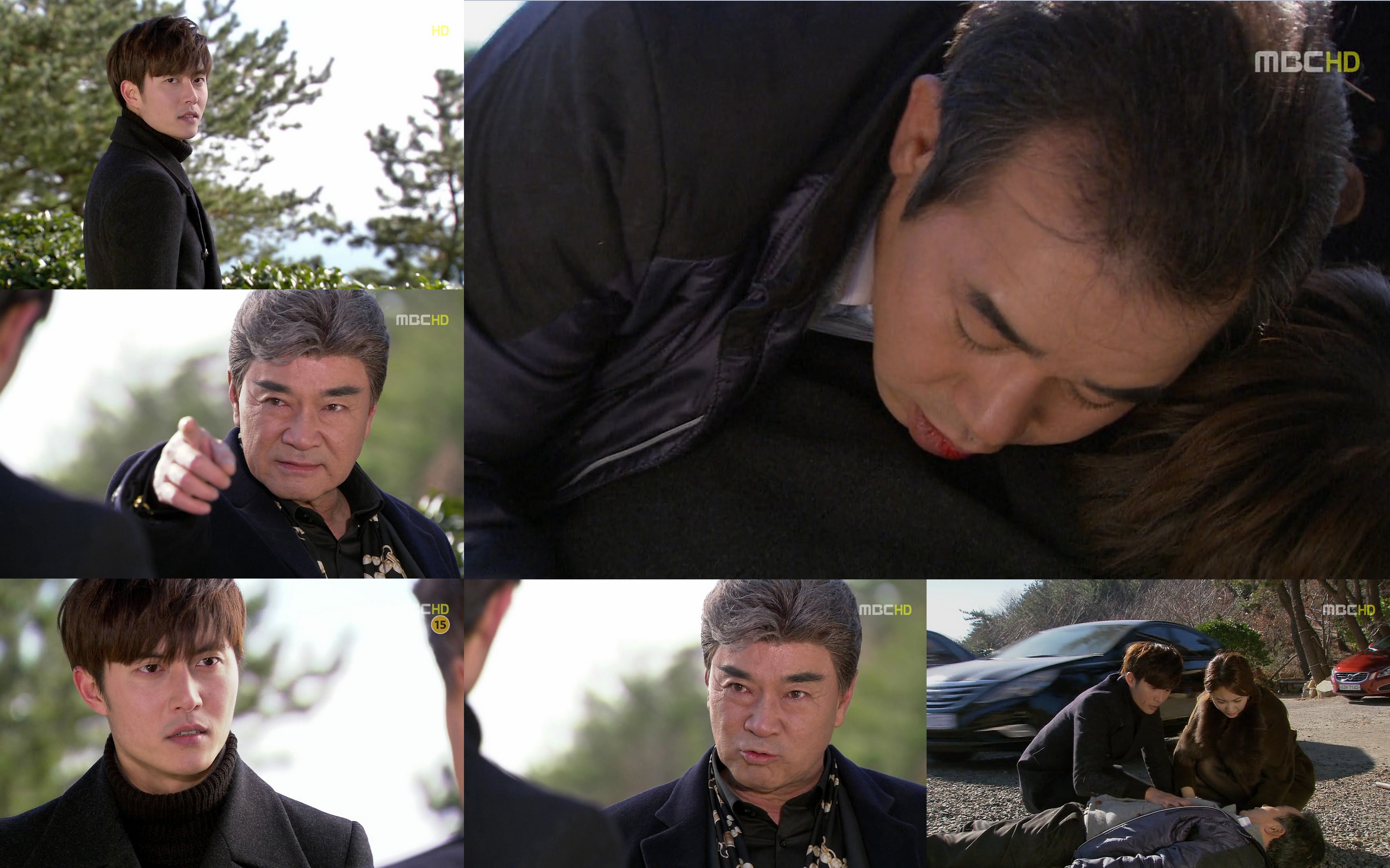 Jang shakes in rage and Chang Hee demnads Jang to kneel and beg. Jang just laughs. Who will kneel down in the end? Let’s see. Gi Cheol is then brought in with two carloads of Jang’s men. This shocks Chang Hee. Gi Cheol yells at his son to leave and is hit. Chang Hee then rushes towards his father only to be clubbed in the back by Jang. Father in son lie on the ground in front of Jang. When he goes to slam his club into Chang Hee, Gi Cheol quickly covers his son. Gi Cheol collapses and before Jang can hit Chang Hee, In Hwa arrives. She rushes over to Chang Hee. Jang orders her to be dragged away, but In Hwa reveals it will do no good as she has already called the police. Sirens are then heard in the distance. Jang looks over in shock. HIs men grab him and run for it while he shakes and angrily looks at his daughter before running away. Meanwhile, Chang Hee shakes Gi Cheol who doesn’t respond.