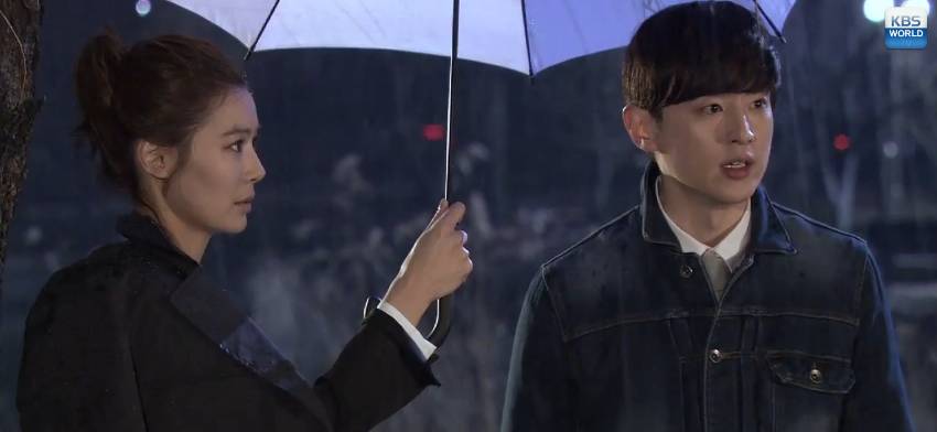 So Aran spills the beans to Ji Seok who just runs out of the house without confronting his grandmother nor stating where he is going. He gets to the lake and there is Seon Yu resting under a tree. He scolds her and urges her home, but she refuses to listen to him as she wants to prove herself to Mrs. Gong and not get fired. Ji Seok, being Ji Seok is keeping mum on his grandmother’s evil doings to Seon Yu and hands over his umbrella and jacket and the two continue the futile search together until Ji Seok forces her to call it a night as they are getting nowhere.