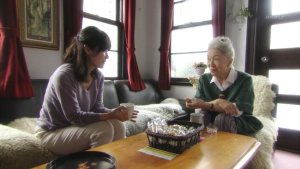 Kasumi goes to visit her mother-in-law Fuji Akari [Kusabue Mitsuko]. Even though she and Fuji Yoji [Koichi Mantaro] have divorced, she maintains a good relationship with his mother who also does old-time portraits for her clients. The two sit down to tea and snacks and Kasumi asks if Akari has ever been to a party. Why? Has a man invited Kasumi to one? Kasumi laughs it off saying she believes Yuri was only teasing her with the invitation. While they are chatting a song comes on the radio. Akari loves the song and goes to turn up the volume; it is called “Forbidden Games.” This song really seems to affect Kasumi. It is also a favorite song of hers. This surprises her MIL. Kasumi then opens up about the summer her mother passed away when she was 14. She was sent to live with her maternal grandmother for awhile in 1986.